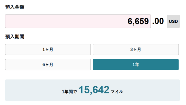 6,659USDを1年間預け入れた場合にもらえるマイルを「マイルシミュレーション」の「預けて マイル」に入力して計算しますと、15,642マイルがもらえる計算になります。(※2026年1月執筆時)